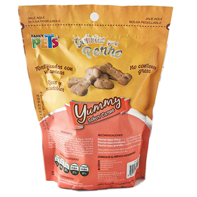 Harina de trigo, salvado de trigo, azúcar, sal, agua, manteca vegetal, bisulfito de sodio, extracto de tocoferol, extracto de romero, vitamina A, vitamina D3, vitamina E, vitamina K3, vitamina B1, vitamina B2, vitamina B6, vitamina B12, vitamina C, nicotinamida, ácido pantoténico, ácido fólico, biotina, betacaroteno, cloruro de colina, cobre, hierro, manganeso, zinc, selenio, carbonato de calcio, colorantes artificiales (caramelo, rojo, carmín), saborizante artificial (carne).