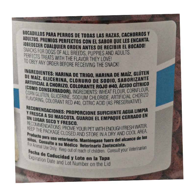 Harina de trigo, harina de maíz, gluten de maíz, glicerina, cloruro de sodio, saborizante artificial a chorizo, colorante rojo #40, ácido cítrico como conservador.
